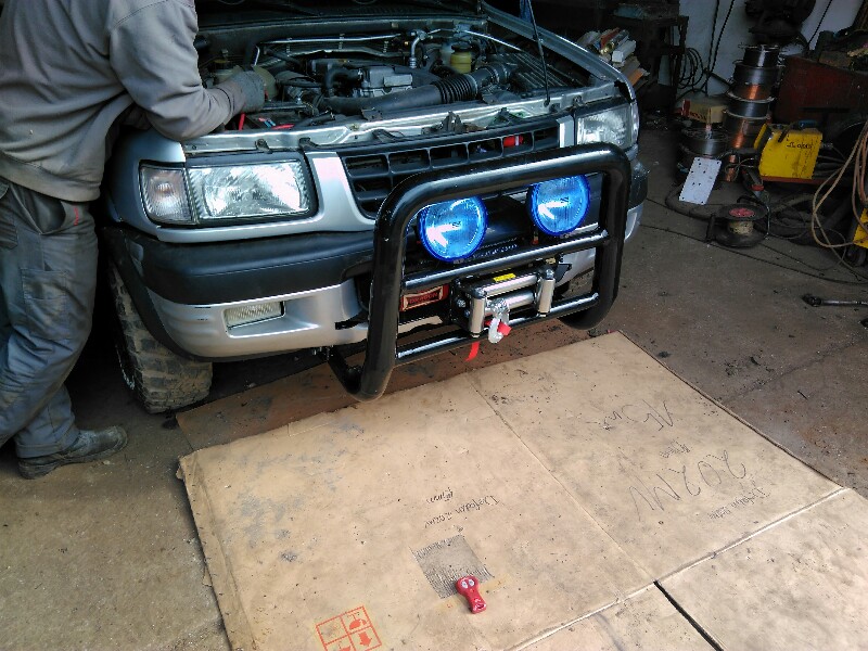 W Fronterze A nie jest tak prosto zamontować wciągarkę ze względu na to ,że rama auta jest dość głęboko schowana pod chłodnicę i nie ułatwia tego też przystosowanie przedniej części auta pod strefę zgniotu dlatego żeby zamontować taką wciągarkę trzeba wykonać ściśle dopasowaną płytę uwzględniając wiele istotnych parametrów np.(płyta będzie wysunięta do przodu i do góry względem punktów mocowania na dużej rozpiętości w stosunku do szerokości śrub mocujących samą wciągarkę )