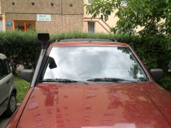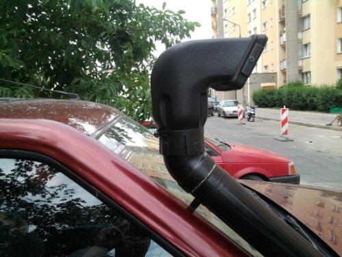Teraz można było już wycinać otwór w błotniku, ale dalej wychodziło, że skończy się prawie na nadkolu. Ponieważ wygięcie rury nie wchodziło w grę (brak odpowiedniego sprzętu a poza tym była już jajowata), więc musiałem zapomnieć, że rura będzie biegła równolegle do krawędzi szyby i pogodzić się z faktem, że kominek będzie wystawał poza obrys auta. Także jakby ktoś chciał pójść w moje ślady i wstawić rurę metalową, to niech lepiej znajdzie najpierw dojście do giętarki do rur albo skombinuje stosowne kolanka (najlepiej elastyczne). Inna opcja to wymienić błotniki na wersję od Sporta (mocowania chyba pasują?).