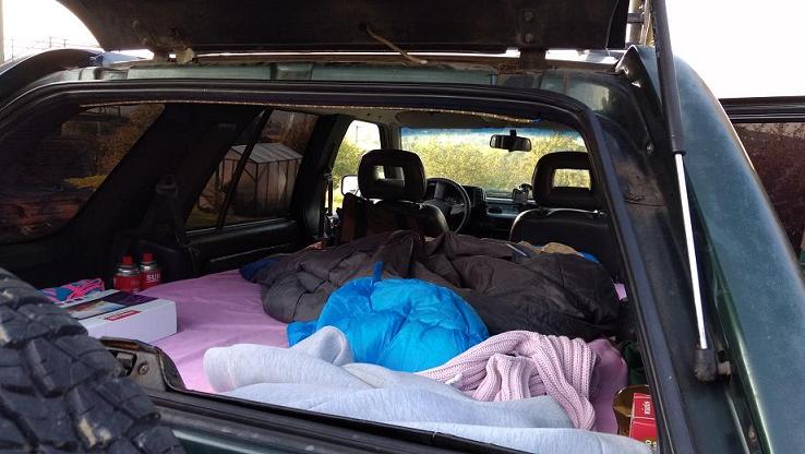 Spaliśmy na dziko tzn. w miejscach, które uznaliśmy za bezpieczne. I chyba takie były, skoro nikt nas nie okradł, nie zgwałcił, nie zabił. Przykładowo: duże stacje, gdzie śpią tirowcy, środek małego miasteczka, parking w Parku Montjuic, ulica przy plażowym deptaku. Wszystko za free. Nie byliśmy na żadnym kempingu, w hotelu itp. Spanie, które zrobił B. w naszej frocie okazało się bardzo wygodne. Do tego na wyposażeniu kuchenka i prysznic. Z toalet korzystaliśmy po drodze.