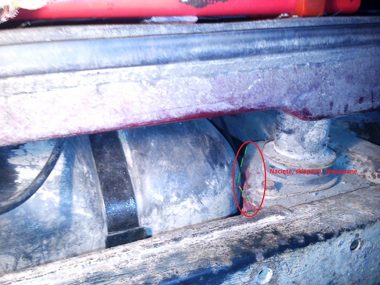 Podobnie trzeba było postąpić z belką usztywniającą poprzecznie podłogę bagażnika (na fotce nie widać, jest w głębi). Fragment baku pomiędzy taśmami stykał się z nią a ponieważ buda kiwa się na boki (bodylift!) musiałem zapobiec przetarciu się baku w tym miejscu. Belka w środkowej części została rozcięta, sklepana i zaspawana. W ten sposób z profilu prostokątnego powstał trójkątny i kolizja usunięta.