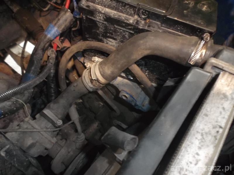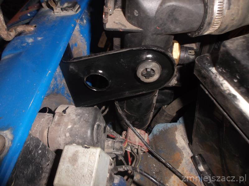 Boczne mocowania chłodnicy wyciąłem z Omegi, ale dospawałem do nich kątowniki mocujące do pasa przedniego. Dolne wykorzystałem z Froty, ale też wycięte z pasa, przerobione i wspawane z powrotem. Nie udało mi się za to wpasować wentylatorów klimy z Omy (tych prostokątnych). Są ciut za duże, żeby je upchnąć w pasie przednim, więc jako wentylatory wspomagające zostawiłem te od klimy z Froty. Tylko przerobiłem im mocowania, żeby je dosunąć do chłodnicy. Wentylator główny (ten z Omy) pracuje na włączniku w chłodnicy (I bieg). Drugi bieg włącznika podpiąłem do jednego z wentylatorów klimy. Drugi wiatrak klimy jest podpięty do włącznika ręcznego w kabinie.