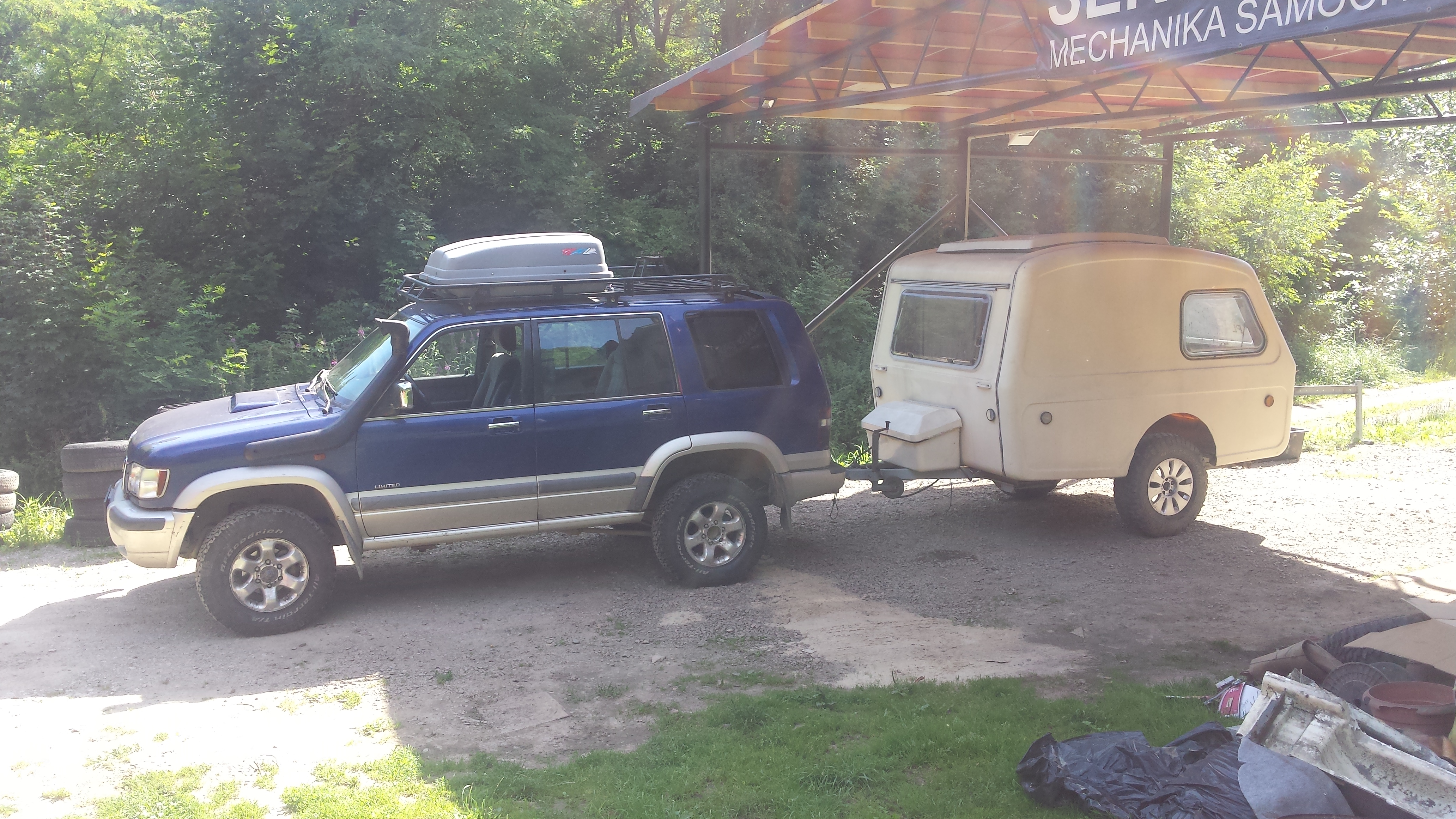 To samo z przyczepą. Znam już przynajmniej 3 osoby z Polski które jeżdżą z offroadowym Niewiadówkiem na wyprawy(w tym Rumunia, Grecja) i jakoś żadnemu się nie rozpadła od jazdy po szutrach. Niewiadówek to jednoelementowa skorupa z laminatu o grubości 5mm na ramie stalowej. Żeby mocowania się nie rozlatywały to cała powierzchnia podłogi jest z wodoodpornej sklejki przykręcona 12 śrubami przez laminat do ramy, taka jedna wielka podkładka. Zdaje się że dużo cięższa karoseria Frontery do ramy też przykręcona jest tyloma śrubami.