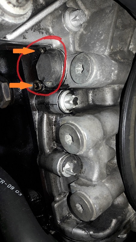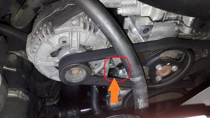 Bok silnika z samego przodu przy alternatorze, jest tam łeb śruby na klucz 19 wkreconej w silnik to w lusterku widze jakby mały otwor I z tej okolicy zaczyna się mokry ślad podejrzewam że to pompa do wymiany